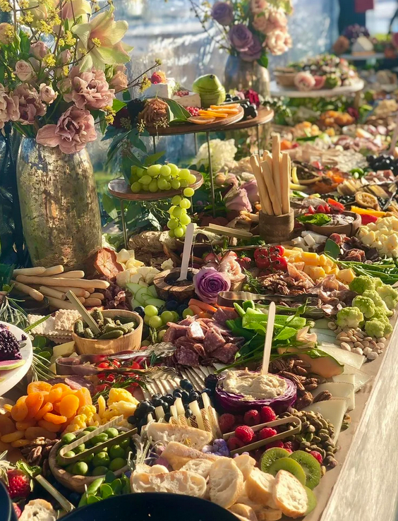 A lavish table with an abundant selection of locally sourced vegetables, house-made dips, local and imported gourmet cheeses, cured meats or vegan options, fresh and dried fruits, pickled vegetables, crackers, breads a variety of accoutrements.